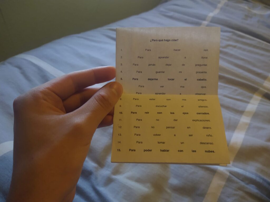 Em três relatos sobre exibições de seus próprios filmes, Diego Hernández explora as forças que movimentam o seu cinema. Uma conversa íntima em que o diretor tenta – e também se esquiva de – responder o que busca ao fazer filmes.